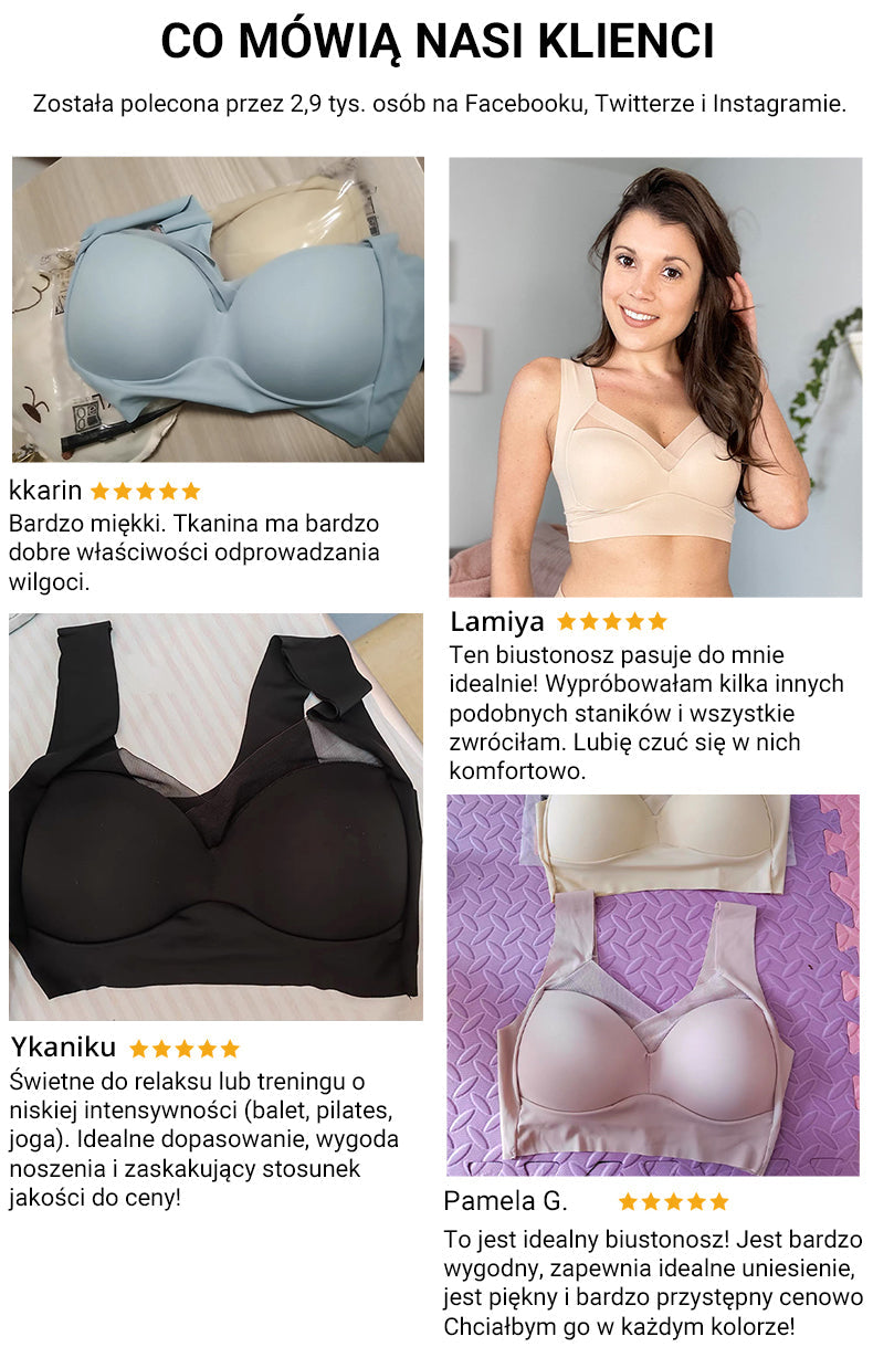 Biustonosz zapewnia bezprzewodowe wsparcie, a jednocześnie jest wystarczająco rozciągliwy, aby nie szczypać ani nie powodować nieprzyjemnego tłuszczu na plecach i pod pachami. Wygładza boczne cycki, wybrzuszenia i nieestetyczne linie biustonosza.